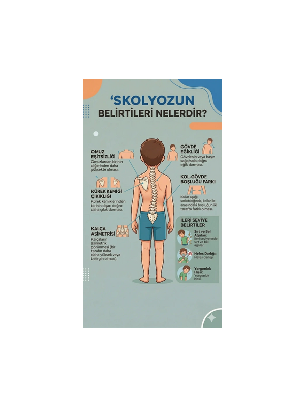 Skolyoz başlangıç evrelerinde genellikle ağrıya neden olmaz ve bu nedenle fark edilmesi zor olabilir. Erken teşhis için ailelerin çocuklarını gözlemlemesi kritik önem taşır. En sık karşılaşılan belirtiler şunlardır: