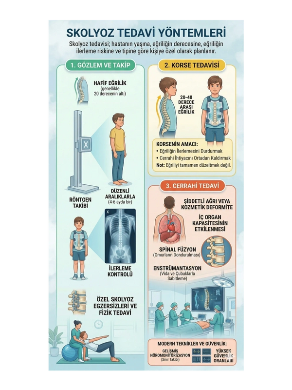 1. Gözlem ve Takip:Eğriliğin hafif olduğu (genellikle 20 derecenin altı) ve büyümesi tamamlanmaya yakın olan hastalarda düzenli aralıklarla (4-6 ayda bir) röntgen çekilerek ilerleme olup olmadığı kontrol edilir. Özel skolyoz egzersizleri ve fizik tedavi bu sürece destek olabilir.