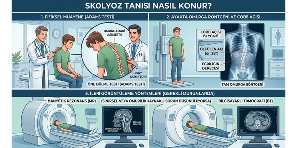 Hastalığın teşhisinde öncelikle detaylı bir fiziksel muayene yapılır. Hekiminiz, "öne eğilme testi" (Adams Testi) ile omurgadaki asimetriyi değerlendirir. Kesin tanı ve eğriliğin derecesini (Cobb açısı) belirlemek için ayakta çekilen tüm omurga röntgenlerinden faydalanılır. Gerekli görülen durumlarda, özellikle sinirsel veya omurilik kaynaklı bir sorun düşünülüyorsa Manyetik Rezonans (MR) veya Bilgisayarlı Tomografi (BT) gibi ileri görüntüleme yöntemlerine de başvurulabilir.