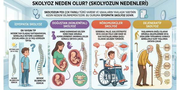 Skolyozun pek çok farklı türü olmakla birlikte, vakaların yaklaşık %80'inin kesin nedeni bilinmemektedir. Bu duruma idyopatik skolyoz denir. Ancak genel olarak skolyozun nedenleri şu şekilde sınıflandırılabilir: